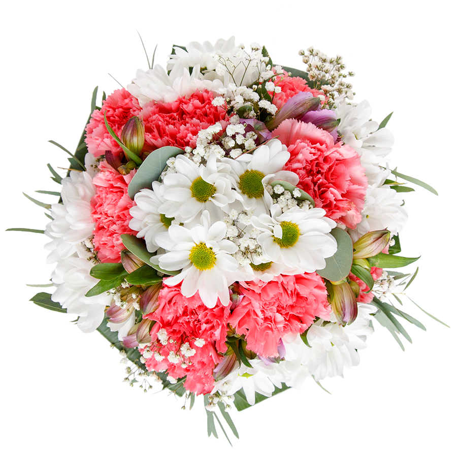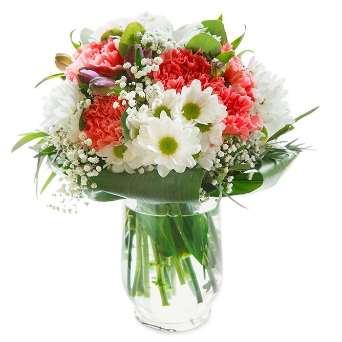 Delight someone special with our luxurious flower arrangement, designed to captivate and enchant. This stunning bouquet showcases a vibrant mix of white chrysanthemums, airy gypsophila, blush light pink carnations, and rich aspidistra leaves.
